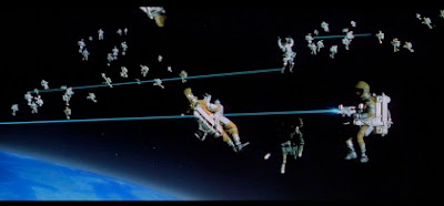 In addition to having a returning character named "Jaws," MOONRAKER uses the famous, five-note theme from CLOSE ENCOUNTERS OF THE THIRD KIND as the electronic combination to a door in a high-security area. Little did the makers of MOONRAKER know that Spielberg would soon begin his own James Bond-ian series (INDIANA JONES) which would eventually include in its third installment a Venice speedboat chase sequence, just like in MOONRAKER! The mind reels.